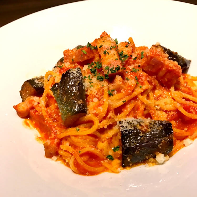 未分類 隠れた名パスタ!! 意外と知られていないカルロの名パスタの内の1つ!!「ナスとベーコンのトマトソースパスタ」ベーコンの旨みが詰まったトマトソースにナスのアクセントが加わり非常に美味でございます♪ 2018.04.12 未分類
